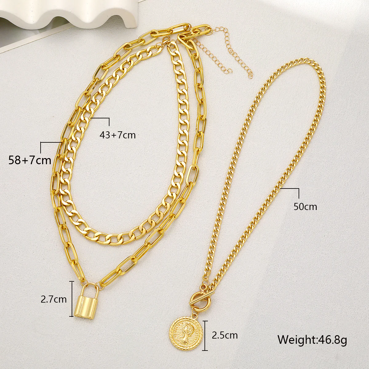 Bold and stylish, this 3-piece necklace set features layered gold chains with a vintage coin charm, chunky paperclip links, and a lock pendant for an edgy-chic vibe.
