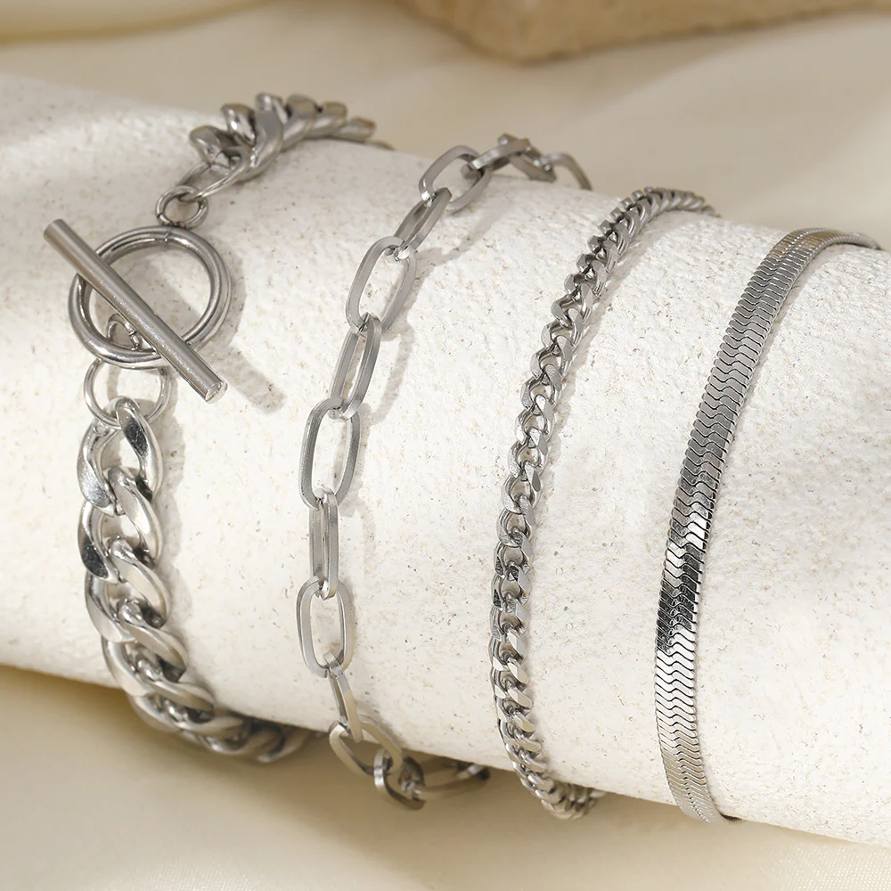 Make a bold statement with this 4-piece gold bracelet set, featuring a mix of sleek herringbone, chunky links, and toggle clasp styles for an effortlessly stacked look.