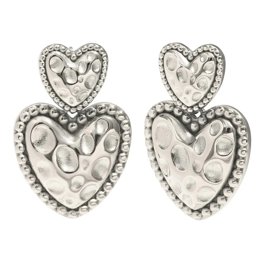 Romantic double heart earrings adorned with intricate beaded detailing along the edges for added texture and sparkle.